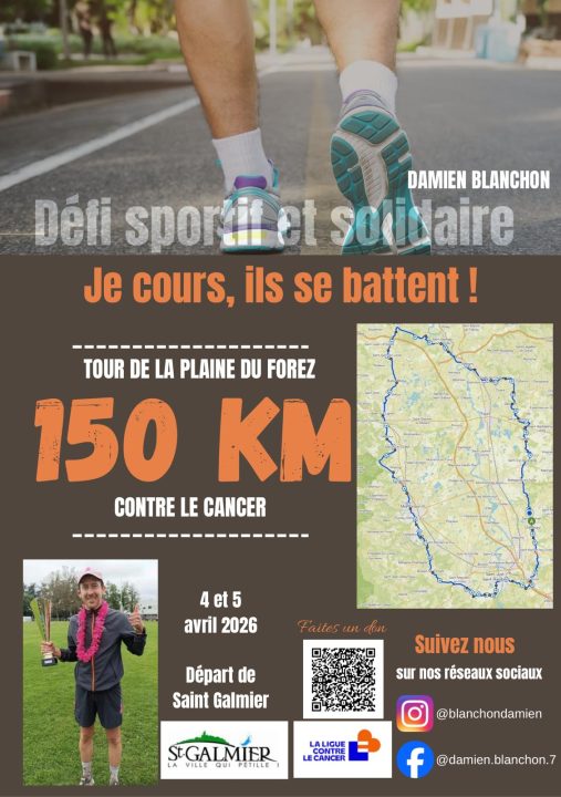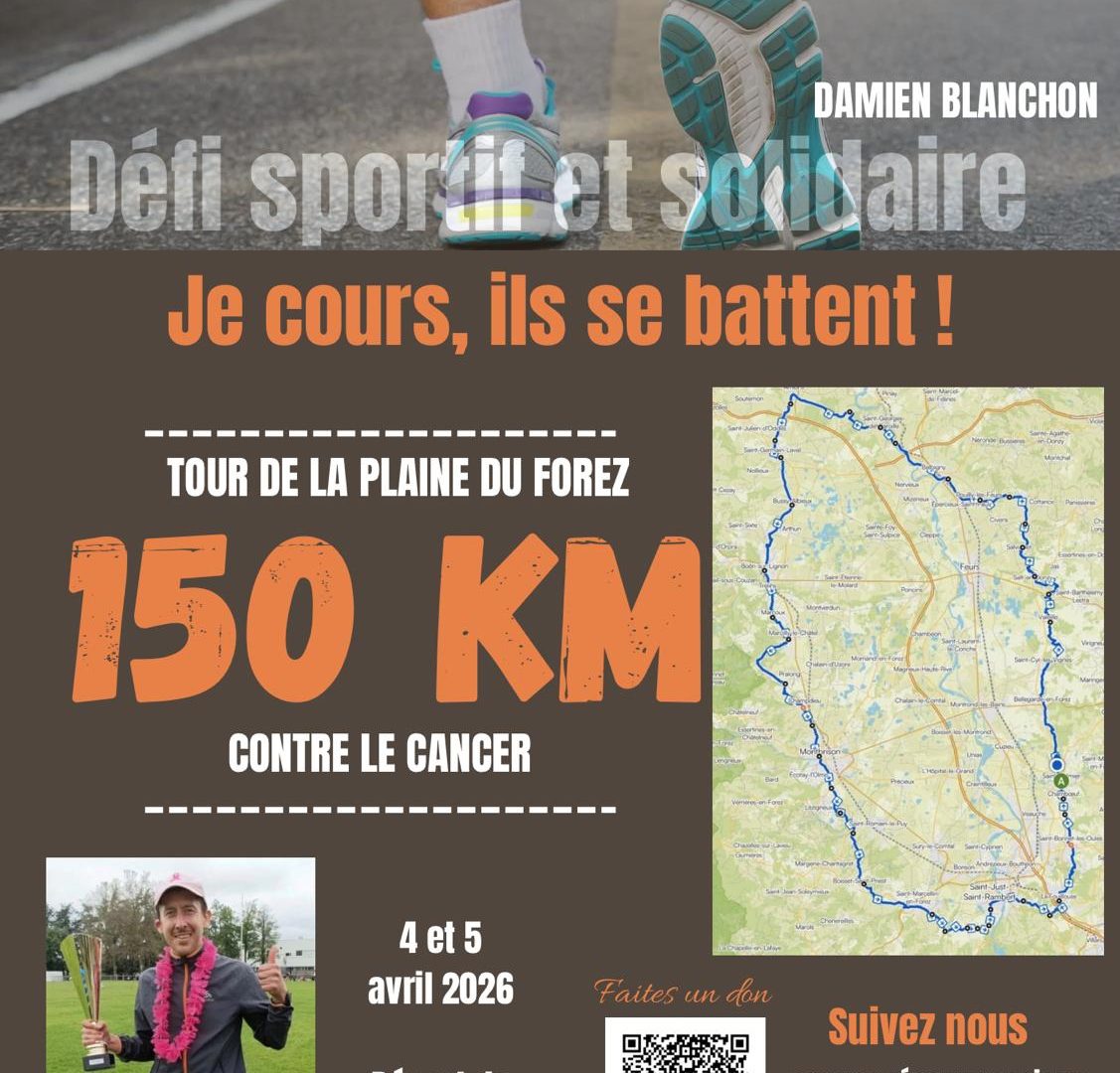 Le 04 avril 2026, Damien Blanchon s'élancera sur un ultra-marathon de 150km correspondant au Tour de la Plaine du Forez. L'objectif de ce défi sportif et solidaire est de collecter des fonds au profit de la Ligue contre le Cancer.