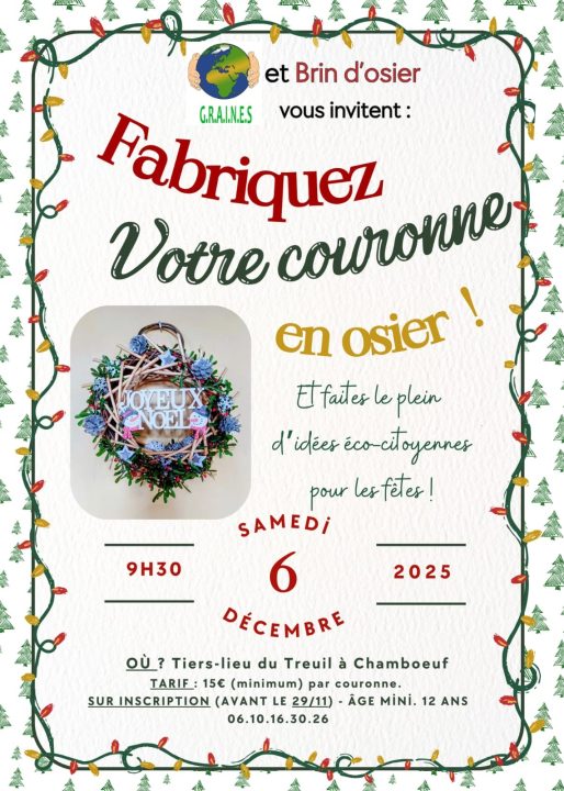 Cette année, l'atelier Noël éco responsable se fera en partenariat avec l'association brin d'osier, vous permettra de fabriquer une couronne en osier et de faire le plein d'idées éco citoyennes pour les fêtes