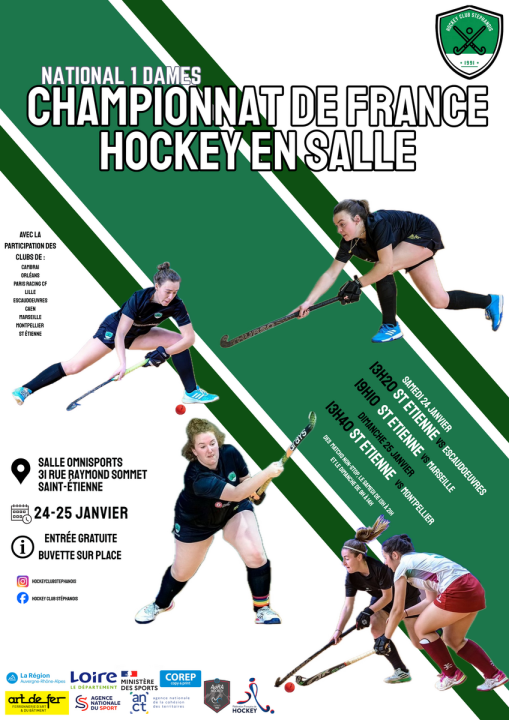 Les 24 et 25 janvier, Saint Etienne accueillera le championnat de France National 1 dame de hockey en salle. Après une première organisation réussie en 2023, la Fédération Française de Hockey renouvelle sa confiance au club stéphanois pour cet évènement d’envergure nationale. Ce dernier tour sera décisif : il couronnera la Championne de France nationale 1 et déterminera les montées et relégations.