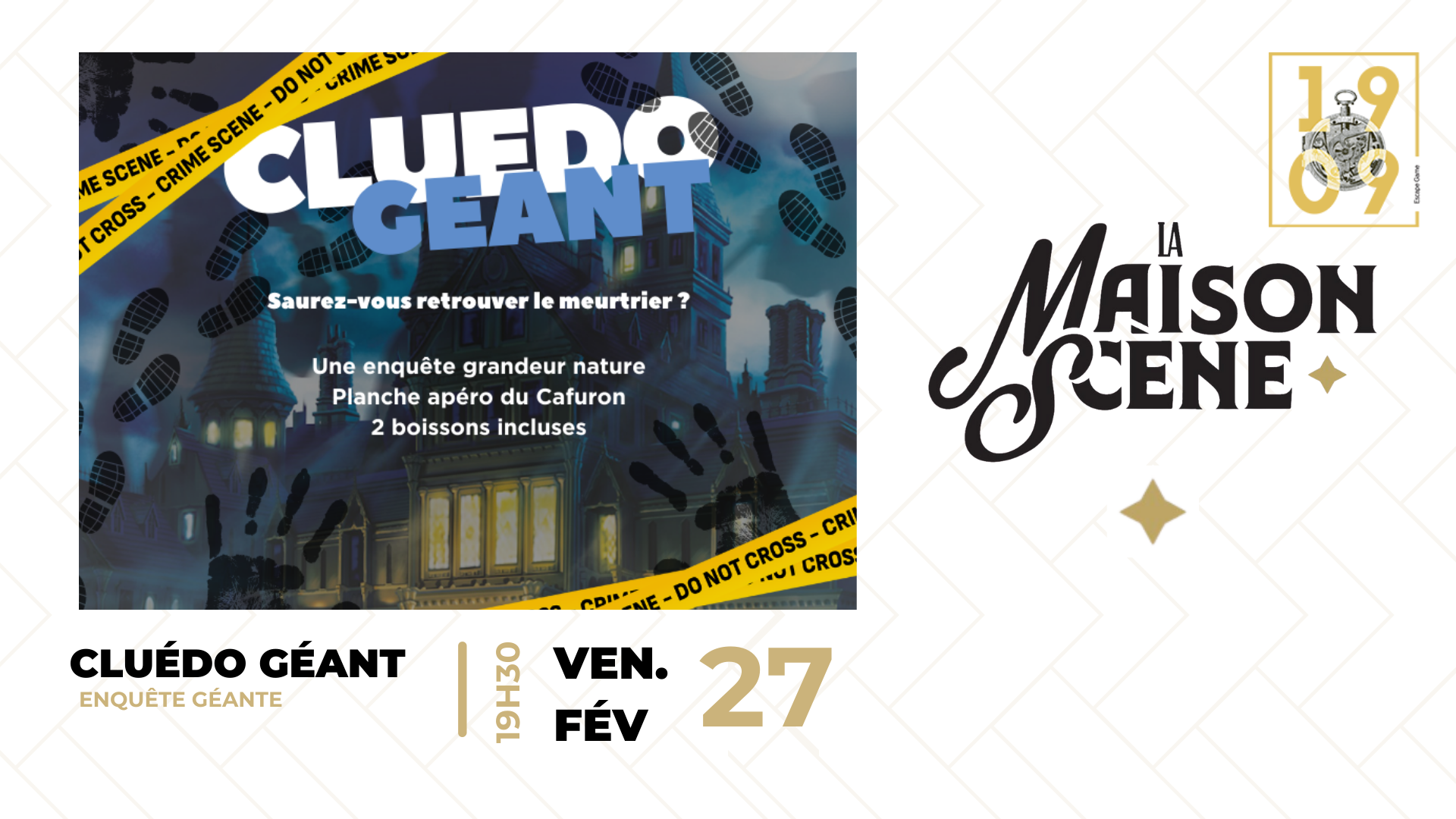 1909 Escape Game et La Maison Scène vous plongent dans une soirée Cluedo grandeur nature. En équipe, enquêtez, interrogez les suspects et traquez les indices autour de planches apéritives et d’un verre de vin. Saurez-vous démasquer le coupable ?