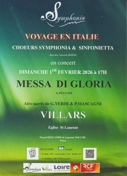 Le programme est construit autour de la Messa di Gloria de Puccini, oeuvre de jeunesse du compositeur, brillante et colorée qui est interprétée par Symphonia dans une lumineuse version pour Choeurs, solistes et deux pianos.