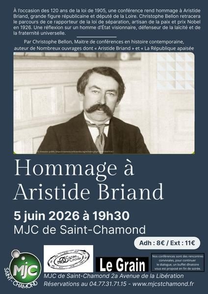 Pour commémorer les 120 ans de la loi de 1905 dite de séparation des Eglises et de l'Etat, nous vous invitons à une soirée hommage à Aristide Briant, grande figure réublicaine, élu député de la Loire en 1902 dans une circionscription comprenant Saint-chamond. Rapporteur de la loi de 1905, onze fois président du Conseil et ministre des Affaires étrangères, il fut co-fondateur de la Société des Nations, ancêtre de l'ONU, et prix Nobel de la Paix en 1926. "Il faut savoir désarmer les esprits pour espérer désarmer les nations", rappelait-il dans son combat pour la paix. M.Christophe Bellon viendra éclairer le parcours de cet homme d'Etat visionnaire qui porta haut les idéaux de justice, de laïcité et de fraternité universelle. Une exposition sur la loi de 1905 sera présentée dans le hall d'accueil de la MJC.