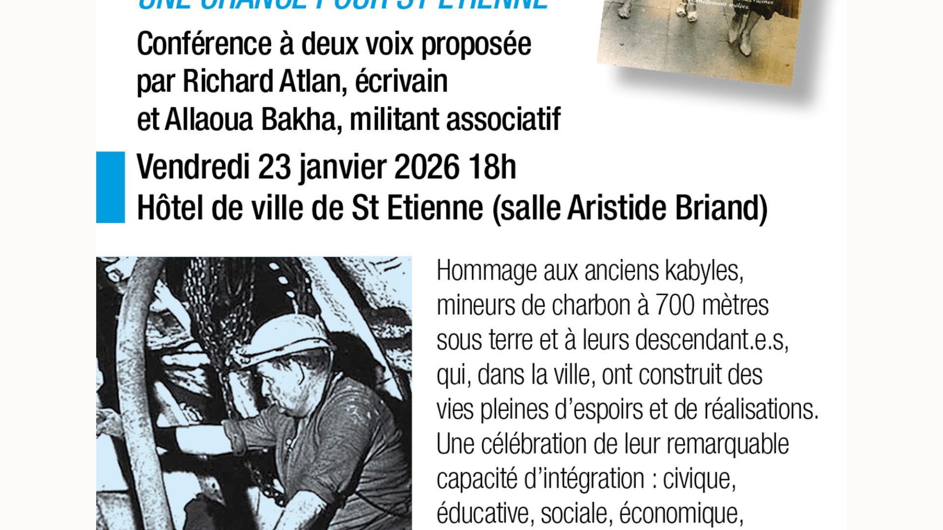 Cette conférence à deux voix est animée par Richard Atlan, écrivain, et Allaoua Bakha, militant associatif. Ils échangeront avec vous autour de l'immigration kabyle d'hier à aujourd'hui, à Saint-Étienne.
