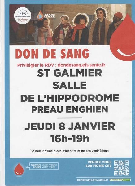 Collecte de sang le jeudi 08 janvier de 16h à 19 heures préau d'Enghien