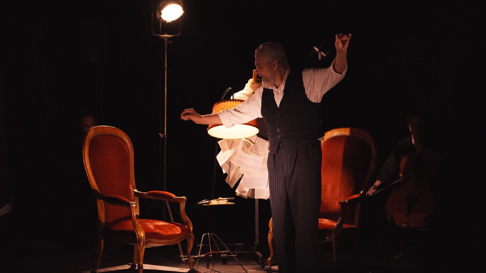 Sur scène, un acteur et trois musiciens, marimba, clarinette et violoncelle, mêlent leurs actions et leurs expressions. La parole du comédien donnera corps aux pensées de l'officier, la musique pourra « dire » le silence