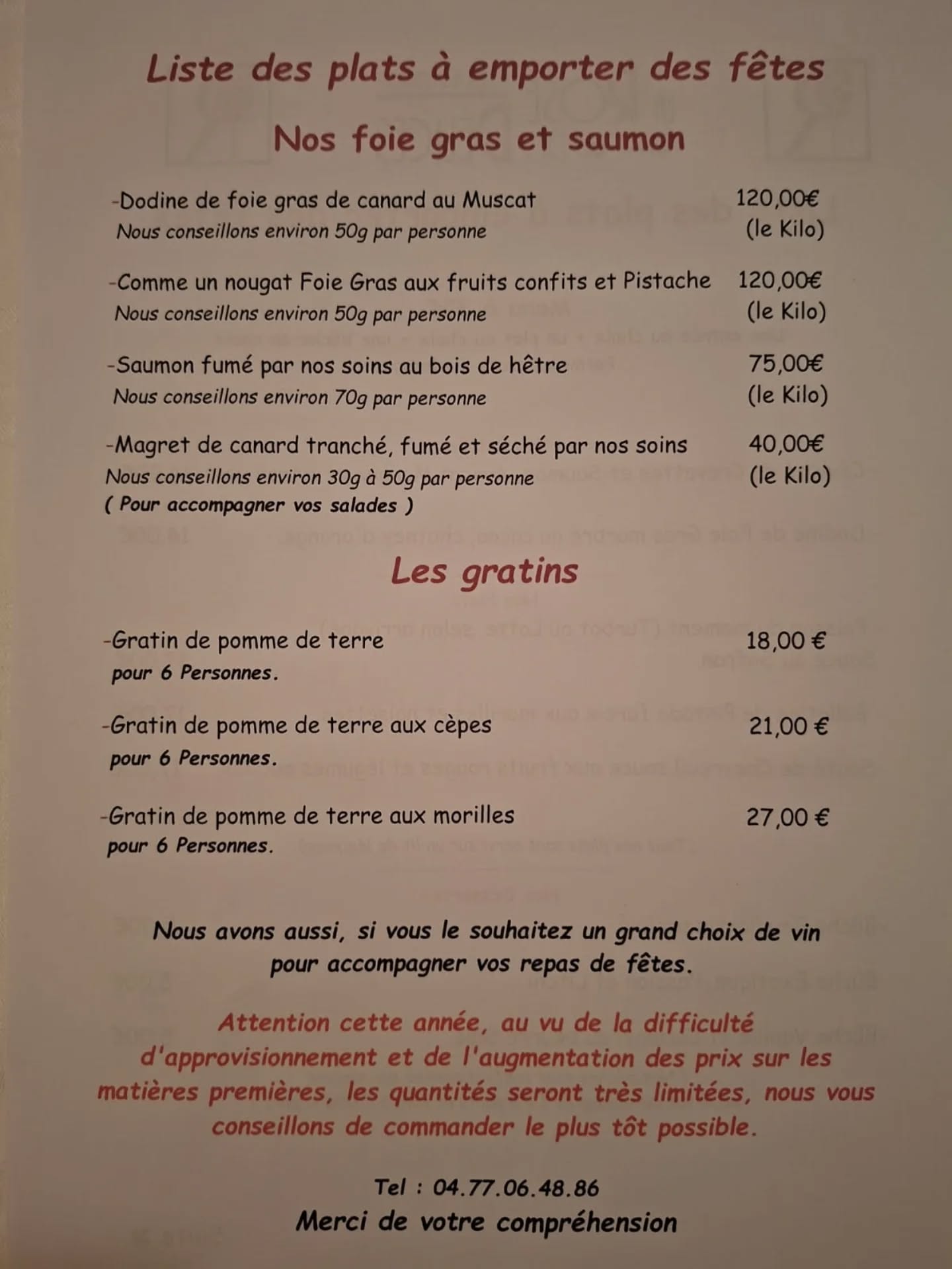 Pour les fêtes de fin d'année nous vous proposons notre liste de plats à emporter