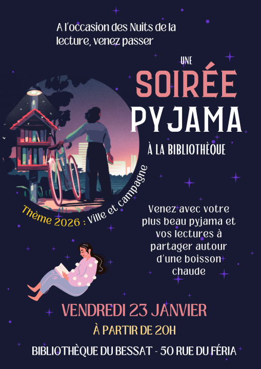 A l'occasion des Nuits de la lecture, la bibliothèque vous invite à une soirée de lectures partagées. Venez avec votre plus beau pyjama et vos lectures sur le thème 2026, "Ville et campagne", autour du boisson chaude !