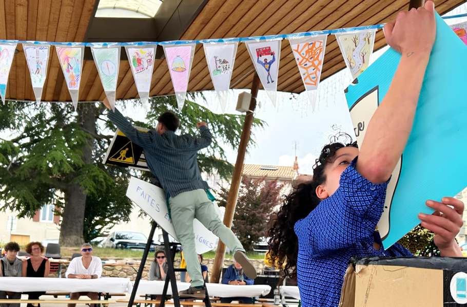 Tout est important. Prétexte au jeu. Tout est dialogue, geste artistique et ludique. Au bout d’une heure le couvert est mis. Les tables et les bancs sont en place. Nous pouvons enfin passer à table et partager ce repas tous·tes ensemble.