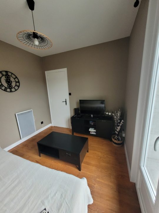 Salon avec TV à écran plat, (offres SFR-chaînes internationales-code privé pour accès vidéos à la demande - Netflix, Prime Vidéo, etc ...), banquette clic-clac (2 couchages d'appoint en 140x190 cm), table basse, placard mural, accès direct à la terrasse privative et surélevée (mobilier de jardin, store banne, ...) orientée sud avec vue sur la campagne.