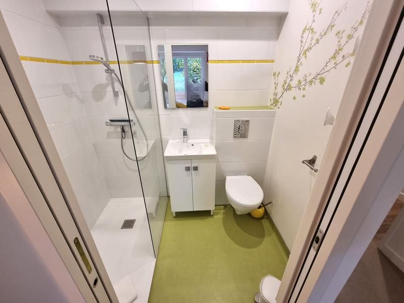 Rez-de-chaussée : Local à vélos sécurisé. Buanderie (évier, lave-linge et sèche-linge privatifs au gîte).