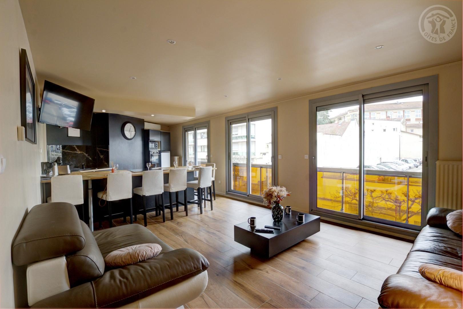 Appartement de 105m² au 3ème étage sans ascenseur, disposant d'une belle pièce à vivre avec cuisine intégrée et équipée ouverte sur l'espace repas et le salon. Ce séjour lumineux grâce à ses 3 baies vitrées permet l'accès direct à un balcon. On retrouve 2 chambres : 2 lits 90x200cm jumelables permettant de créer un lit double sur demande, une suite parentale avec un lit 180x200cm avec télévision et espace bien-être (baignoire balnéo, douche) et une salle d'eau spacieuse avec une belle douche à l'italienne. L'appartement dispose d'une place de parking privée dans la cour de l'immeuble. A seulement 200 m de la gare, avec commerces et services à proximité, cet appartement traversant et chaleureux est aménagé au 3ème étage d'une petite copropriété. Valérie & Richard vous accueillent dans leur meublé "Plénitude" entièrement équipé et rénové avec goût, modernité et confort. L'hébergement est équipé d'un espace bien-être privatif avec une baignoire balnéo 2 personnes pour vous offrir des moments de détente. Pour rendre votre séjour encore plus agréable, les charges de chauffage, d'électricité & de gaz) sont incluses, les lits sont faits à votre arrivée et le linge de lit est fourni.