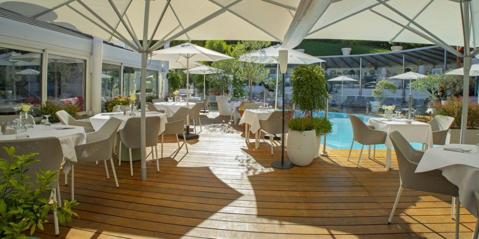 L'espace piscine et restauration en terrasse se trouve en parfaite harmonie avec l'environnement merveilleusement arboré… pour un déjeuner à l'ombre des parasols ou pour un dîner en toute complicité !