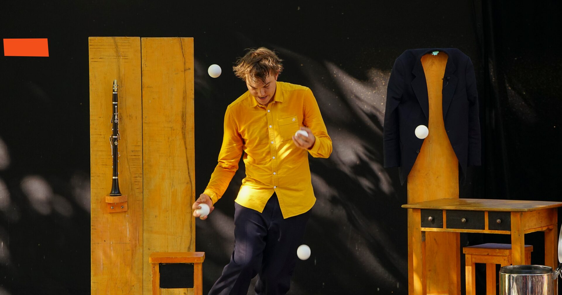 Quelques planches, une table, des tabourets. Et puis des balles, tantôt objets de jonglage, compagnons de jeu et personnages imaginaires, qui peuplent chaque recoin du mobilier… Elles frappent, percutent. C’est un jonglage augmenté : on entend ce qui habituellement n’est que vu.