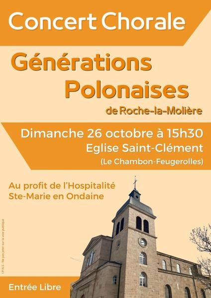 Un après-midi musical avec la Chorale Générations Polonaises de Roche-la-Molière. Le concert permettra de découvrir un répertoire composé d’une quinzaine de titres tant polonais que français, profanes et religieux. Entrée libre, au profit de l'Hospitalité
