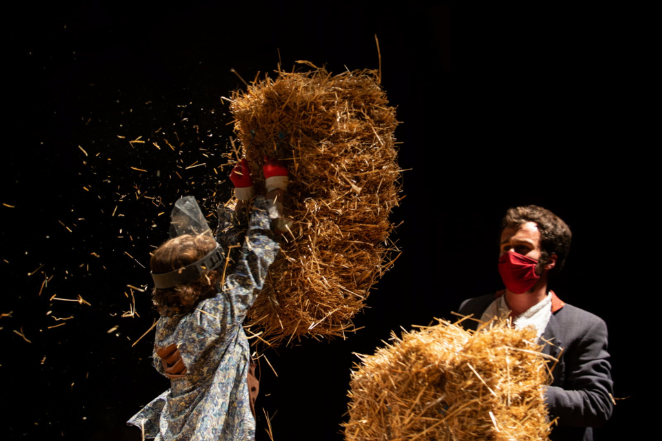 Avec 4 projecteurs, 4 paravents et 4 ballots de paille, ce spectacle tout-terrain permet une mise en scène où vous allez vous retrouver devant, derrière, à gauche, à droite et, inévitablement, avec les comédiens, au coeur de l’intrigue et du jeu. Les trois comédiens endossent les onze rôles avec une fougue et un plaisir jubilatoire. Entre improvisations et interactions avec le public, les artistes s’approchent de l’essence même de l’oeuvre de Molière. Ils mettent en avant son propos satirique, d’actualité, et tentent de peindre le portrait des différentes hypocrisies auxquelles nous sommes confrontés dans notre quotidien.