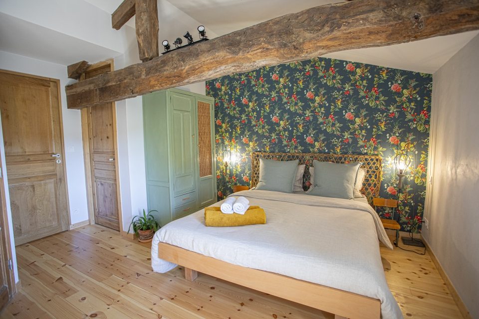 La maison d’hôtes abrite deux chambres où se mêlent velours, murs de pierre, poutres apparentes et tapisseries végétales, dans une ambiance douce.