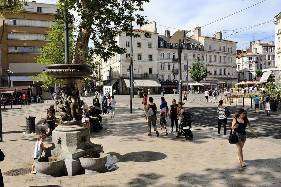 Regardez au sud, vous découvrez les prémices du parc du Pilat, regardez au nord, vous apercevrez la gare de Carnot. La place du Peuple, c’est le passage obligé si vous souhaitez passer de l’est à l’ouest de la ville, c’est là que les trams prennent 2 directions différentes (ceux qui vous descendent à la Terrasse ou vous montent à Bellevue, et ceux qui vous déposent à la gare), c’est également le point de rendez-vous de beaucoup de stéphanois. En somme, cette place est un lieu qui n’a jamais cessé de rassembler et qui est en mouvement constant depuis des siècles : jusqu’en 1848, elle est connue sous le nom de Pré de la Foire, c’est ici que se tient le marché et les réjouissances de la ville. Au 17ème siècle, la place, alors bordée d’arbres, avec ses pierres de lavandières, est décrite comme un véritable paradis terrestre ! Véridique ! Qui dit pierres de lavandières, dit rivière… mais où est-elle passée ? Et bien juste sous vos pieds ! Le Furan, qui prend sa source dans le Parc du Pilat, traverse Saint-Etienne du sud au nord et a été progressivement couvert à partir du 17ème siècle.